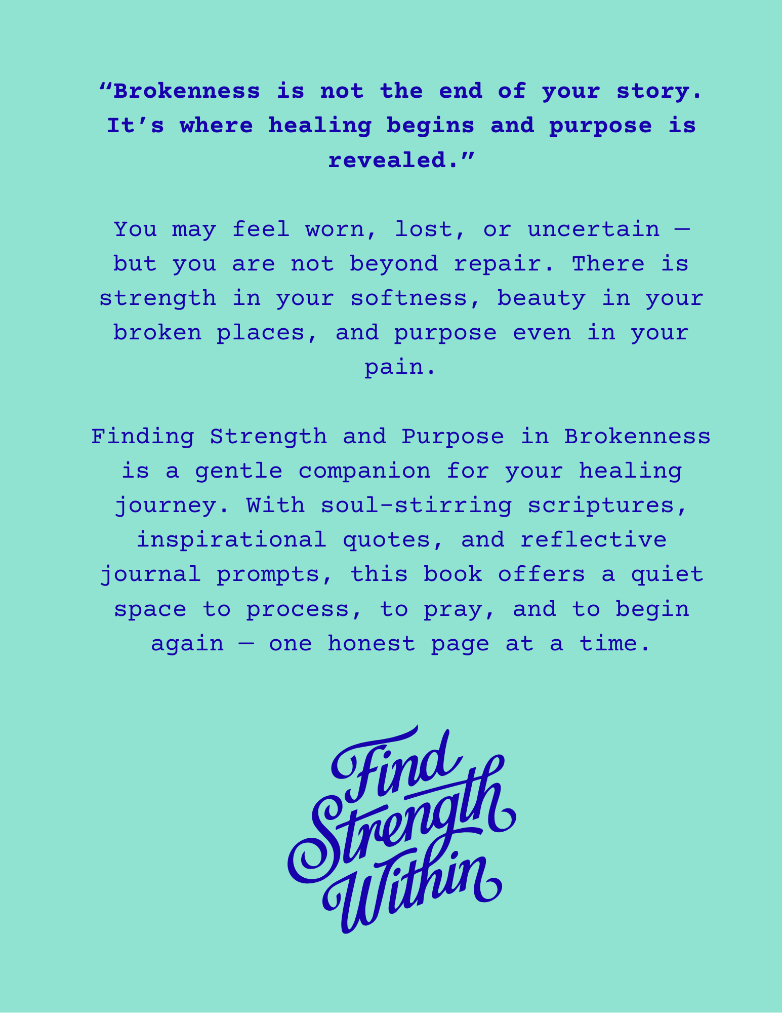 Finding Strength and Purpose in Brokenness offers a calming, faith-centered space to process pain, rediscover hope, and reconnect with your inner strength.